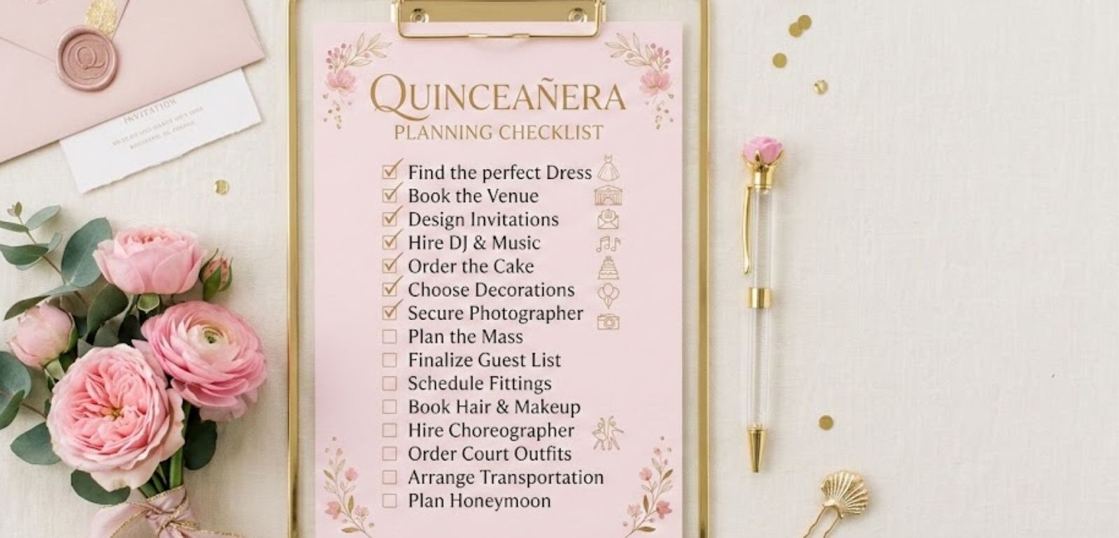 Aquí vas a encontrar todo lo que se necesita para una fiesta de XV años, organizado por categorías para que puedas planear paso a paso.